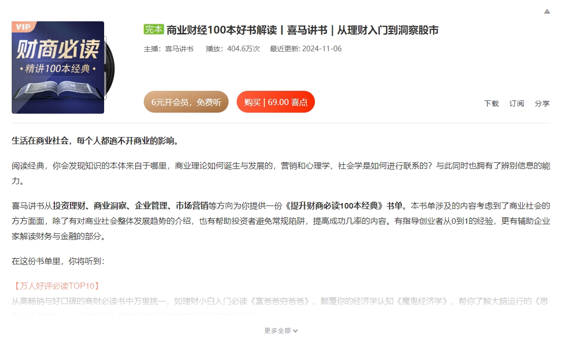 简七的 13 堂极简理财课就像个贴心小老师,从最基础的概念讲起,用生活里的例子让咱们轻松理解理财知识,特别适合零基础的朋友入门。《喜马讲书《提升财商必读 100 本经典》》则像是个知识宝库,把 100 本经典理财书的精华都提炼出来,帮咱们拓宽理财视野,深入学习投资、经济等知识。《财富密码大系列》就更厉害了,它涵盖投资、创业、职场晋升等多个领域,给咱们提供多种财富增长的思路和方法。